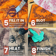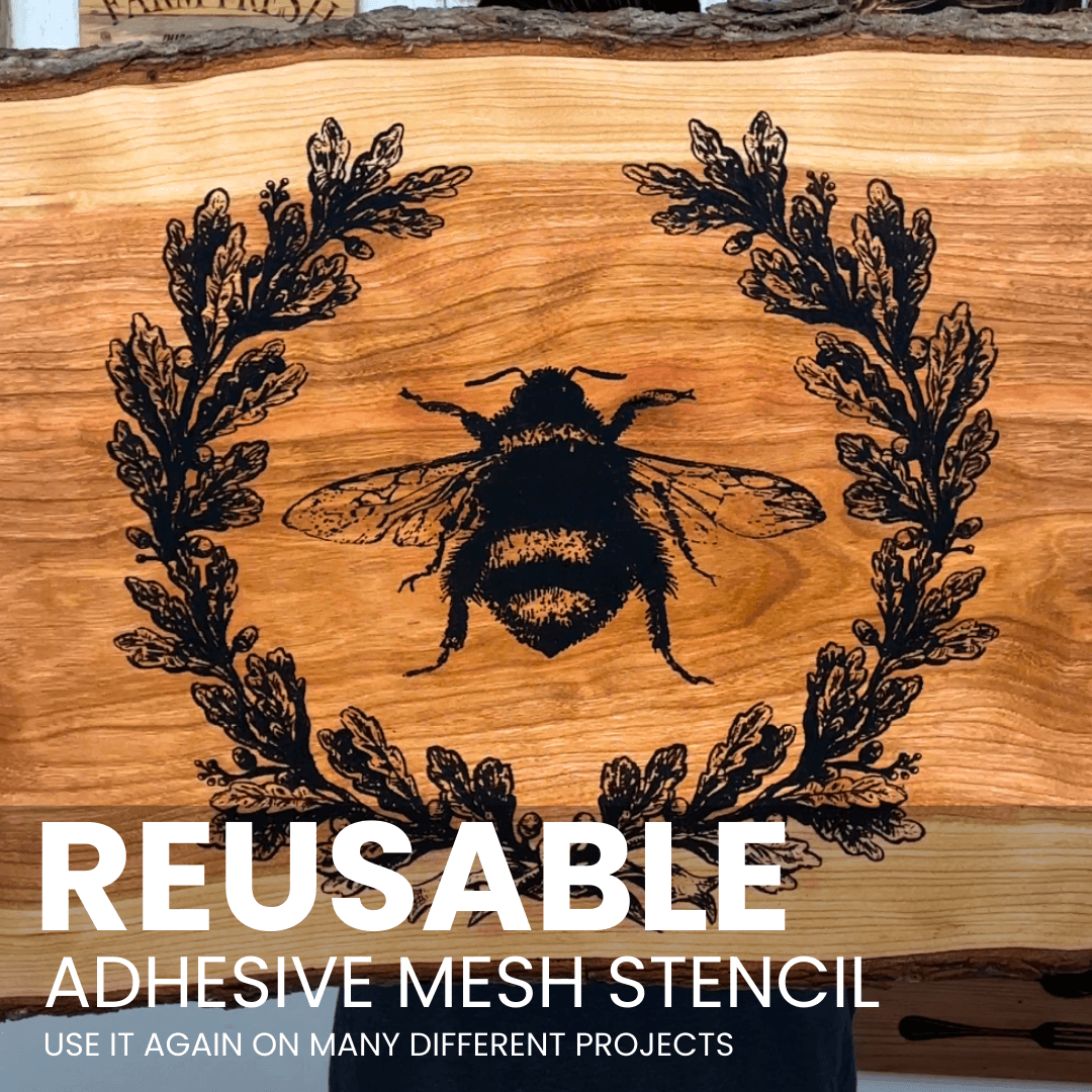 Our stencils work just like any other mesh stencil. Peel of the backing. Apply it, press it down and paint or scrape ink, scorch paint, or paint onto the design. Blot away the extra, remove your stencil and you are done!