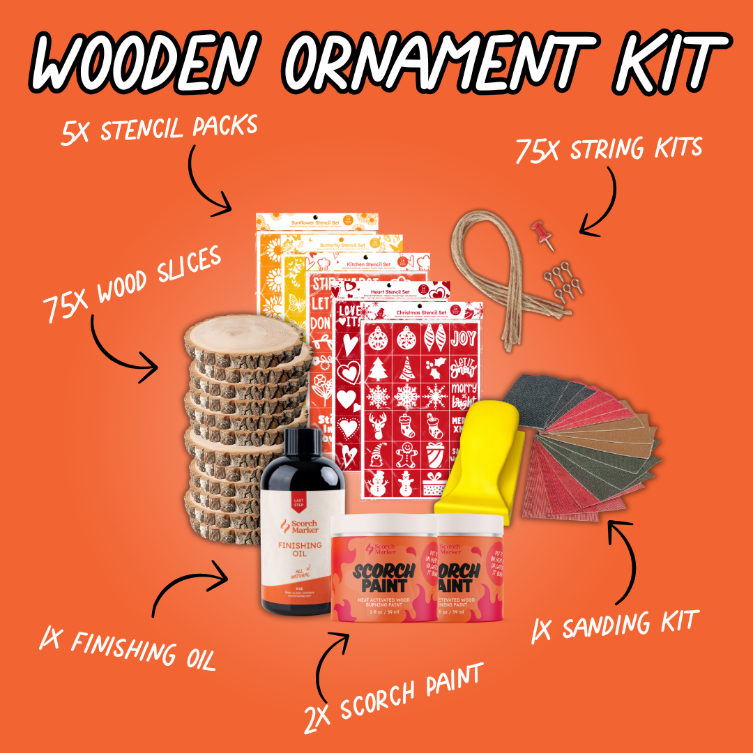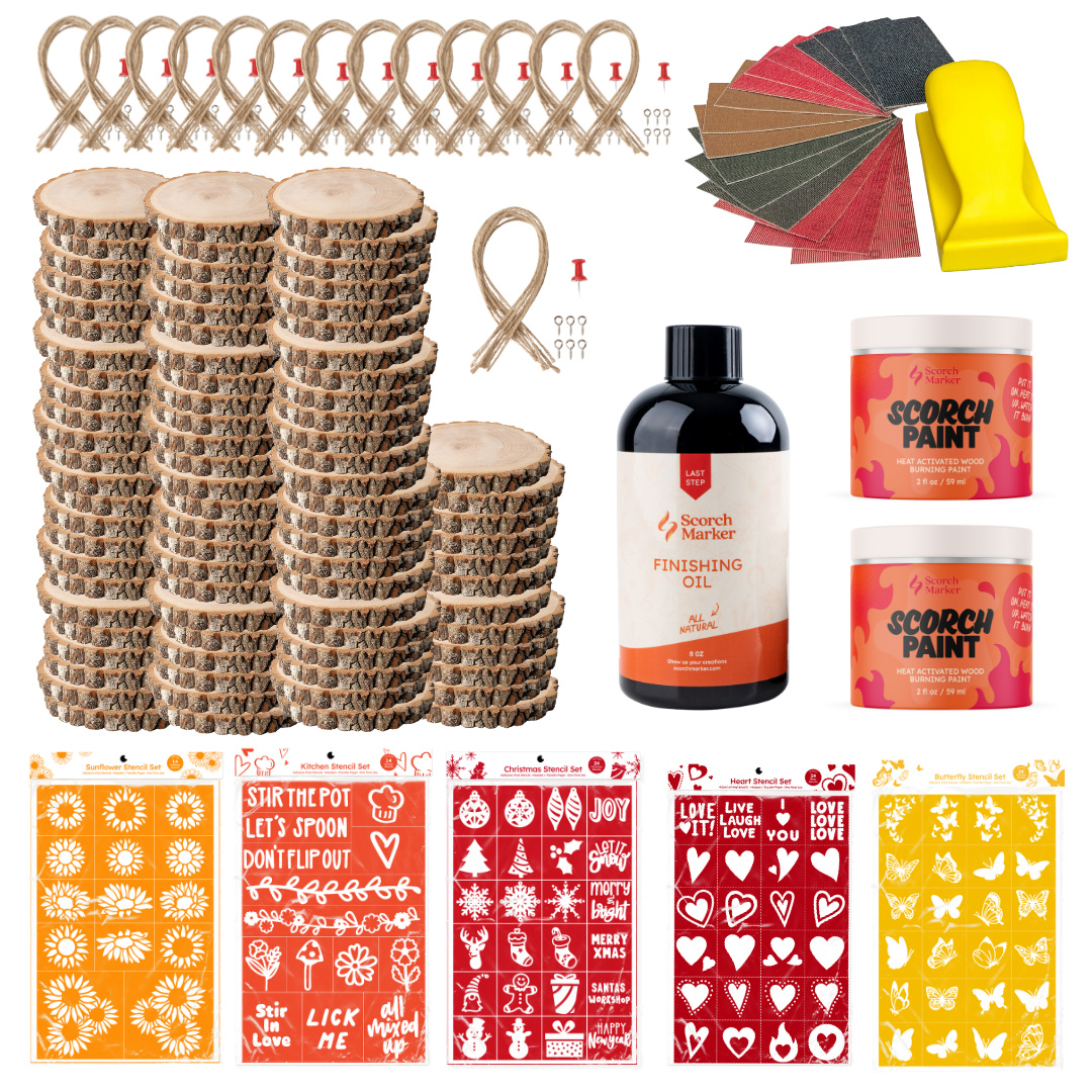 You will get... 75 premium sourwood slices, 2 jars of our NEW Scorch Paint, 1 bottle of food safe finishing oil, 1 mega vinyl stencil bundle, 1 sanding kit, and 15 ornament string kits (6 strings in each pack for a total of 75)!