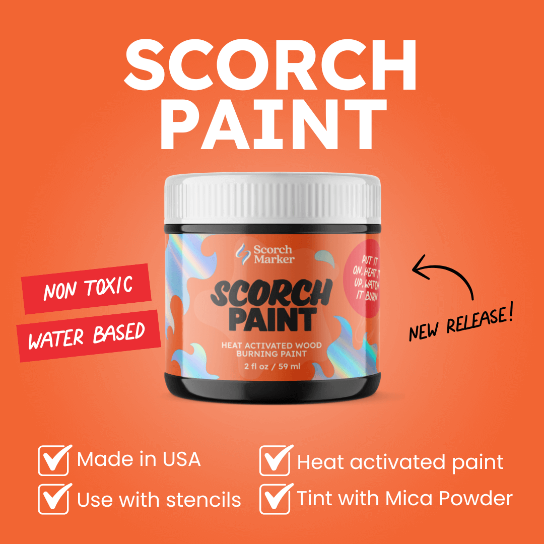 The liquid contains a heat-activated, non-toxic chemical compound. This liquid allows you to paint on a surface, apply heat, and instantly see your design burn into the wood. With Scorch Paint, burning designs has never been easier.