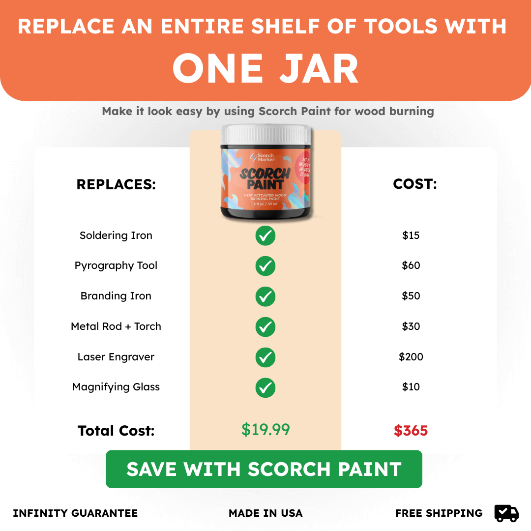 If you don't like it for ANY reason, we'll make it right. Maybe you won't like the jar. Or maybe you won't like how easy it is to burn wood perfectly without ANY previous experience (😉). Heck, maybe you won't like the font we used on the label. NO problem. Send us an email with your order number anytime and we'll give you your money back ZERO questions asked... AND you can keep your Scorch Paint too.