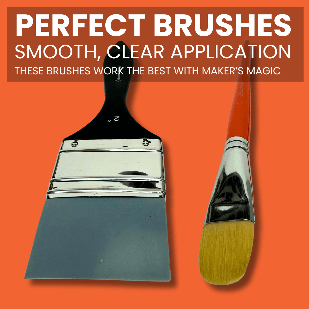 You'll get Marker's Maker's Magic Gloss (8oz), Maker's Magic Matte (8oz), 1 Large Silicon Brush (2 inches wide), and 1 Large Taklon Brush (scallop shaped). And a whole lotta satisfaction from your crafting projects - YAY! Seriously we love these brushes.